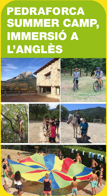 SUMMER DAY CAMP - in Osona and Pla d'Urgell Summer Day Camps with language immersion Day camp in Pla d'Urgell group by age: 3 to 6, 7 to 9, 10 to 12 and from 13. Dates: June 25th to September 6th, 2019 Schedule: from 8:30 am to 6:00 pm Opcional: meal service for lunch Open for registration 3 Day camps in Osona, in Pare Coll - School FEDAC in Vic, Open to everyone Three Day Camps by age: - Beginners Day Camp, campers from grades P3 to P5 - Young Day Camp, campers in 1st to 5th grade - Teens Day Camp, for teenagers up to 16 years of age Dates: June 25th to July 26th and from August 19th to September 6th 2019. Schedule: 9:00am to 1:00pm or to 3:00pm or to 5:00 pm with lunch included. Open for registration 3 Day camps in Torelló, Escola Rocaprevera, Open to everyone Three Day Camps by age: - Beginners Day Camp, campers from grades P3 to P5 - Young Day Camp, campers in 1st to 5th grade - Teens Day Camp, for teenagers up to 16 years of age Dates: June 25th to July 26th 2019 Schedule: 9:00am to 1:00pm or to 3:00pm. Open for registration | |||||||||||||||||